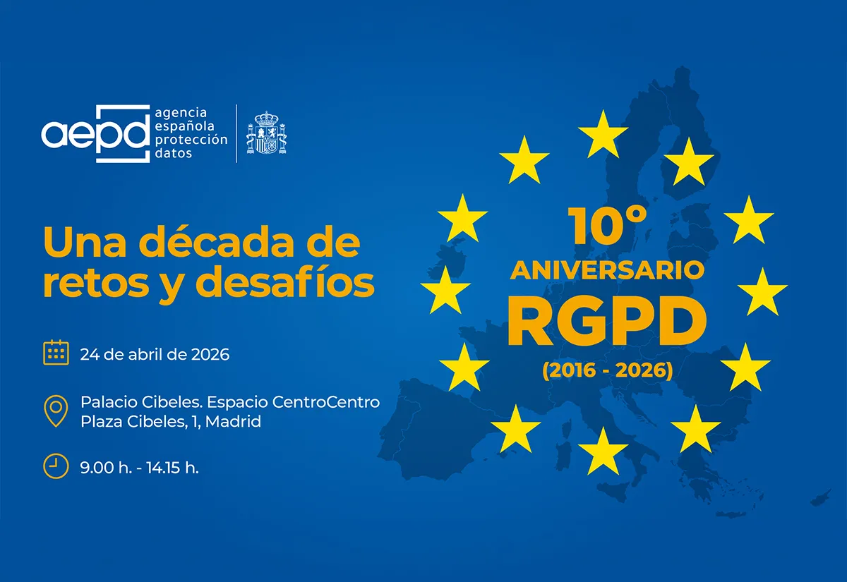 (24 de marzo de 2026). La Agencia Española de Protección de Datos (AEPD) celebrará, el próximo 24 de abril, la jornada ‘10º aniversario del RGPD (2016-2026): Una década de retos y desafíos’, un evento organizado para conmemorar los diez años de la aprobación del Reglamento General de Protección de Datos (RGPD).